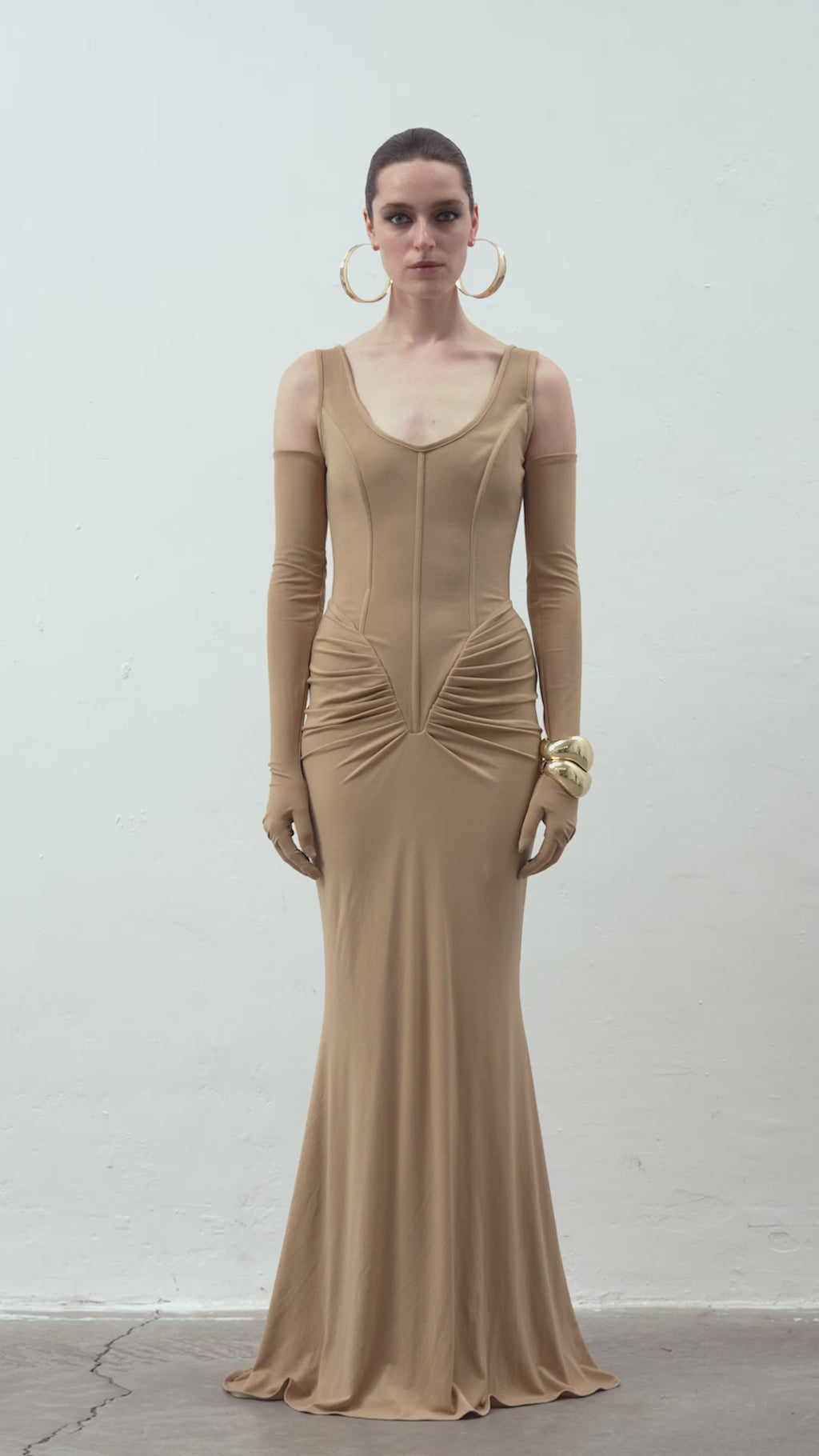 The IRIS Dress features a deep U-neckline and delicate ruching, complemented by a structured corset and matching gloves. Its maxi silhouette creates a refined look, perfect for standing out at special occasions.