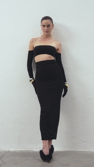 The WENDY Dress in black exudes understated elegance. Its strapless design and cut-out details add a bold touch, while the matching gloves complete the look. With its maxi length and knit texture, the WENDY Dress offers both style and comfort, making it a perfect choice for those who want to stand out at special occasions.