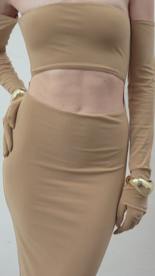 The WENDY Dress in Latte offers a warm, elegant presence. Its strapless cut and subtle cut-out details bring a modern twist, while the matching gloves complete the ensemble. With its maxi knit design, the WENDY Dress ensures comfort without compromising on style, making it a perfect choice for those looking to make a statement at special occasions.